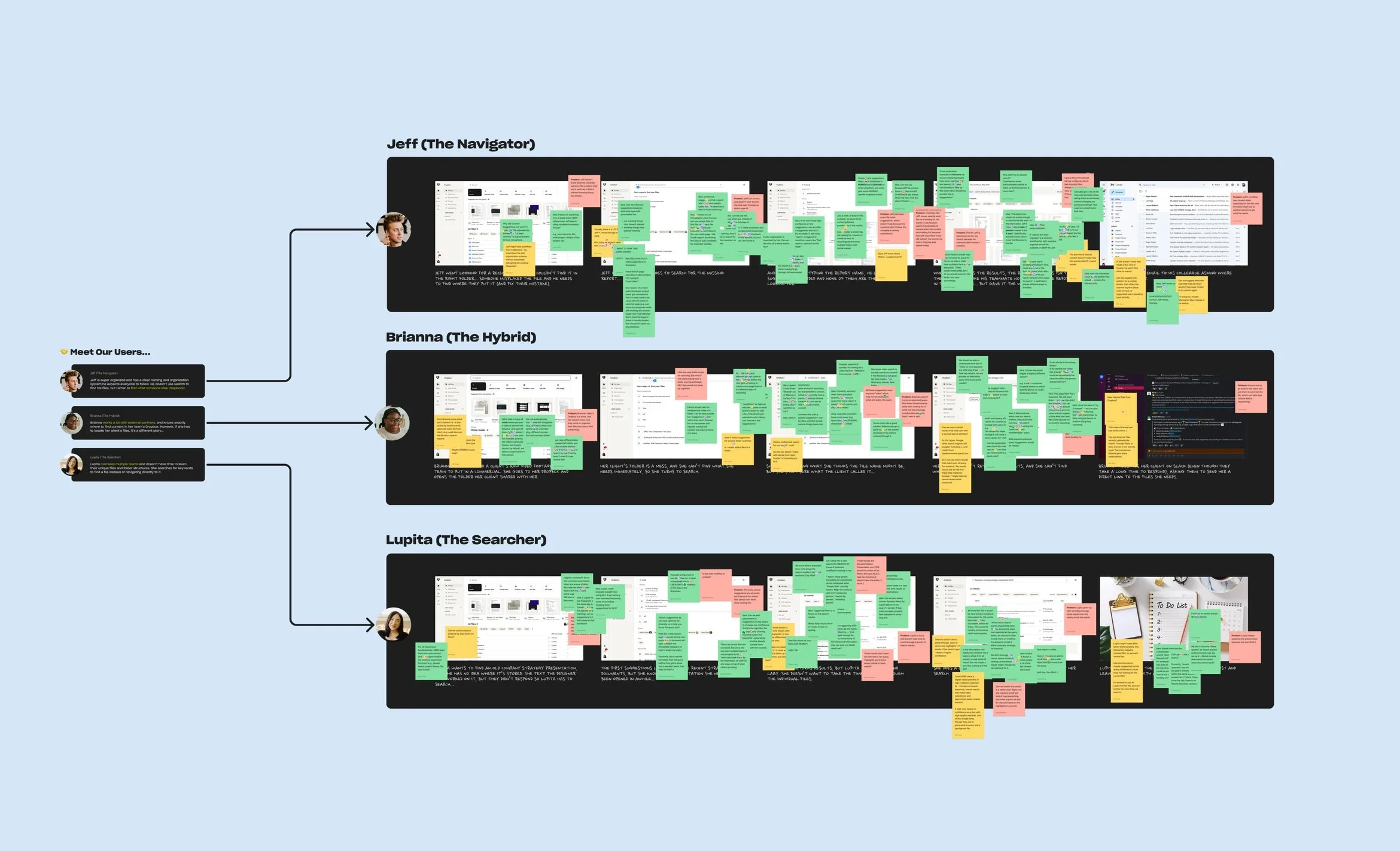 Using existing user research on search behavior and performance metrics, I developed three distinct user personas that embodied the spectrum of individuals we wanted to engage in the search experience: the navigator, hybrid, and searcher.