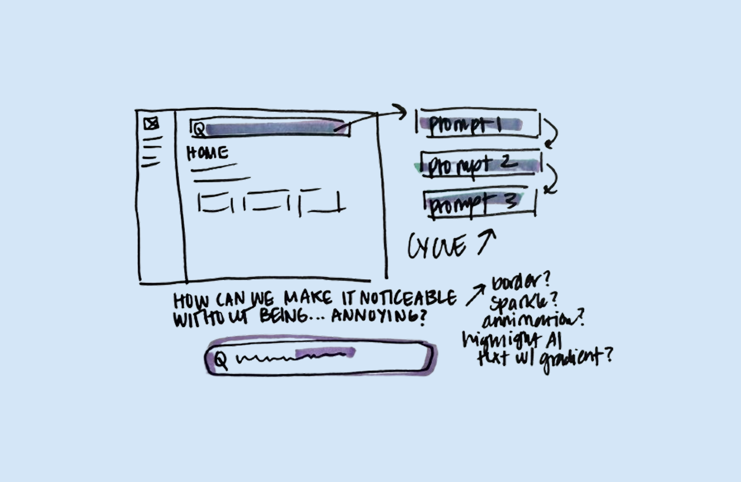 In user research, we often heard “I wish I could search by describing what something looks like.” This functionality already exists but users didn’t know about it. To improve discoverability of search capabilities, we could introduce a cycle of prompt suggestions into the default state of the search bar.